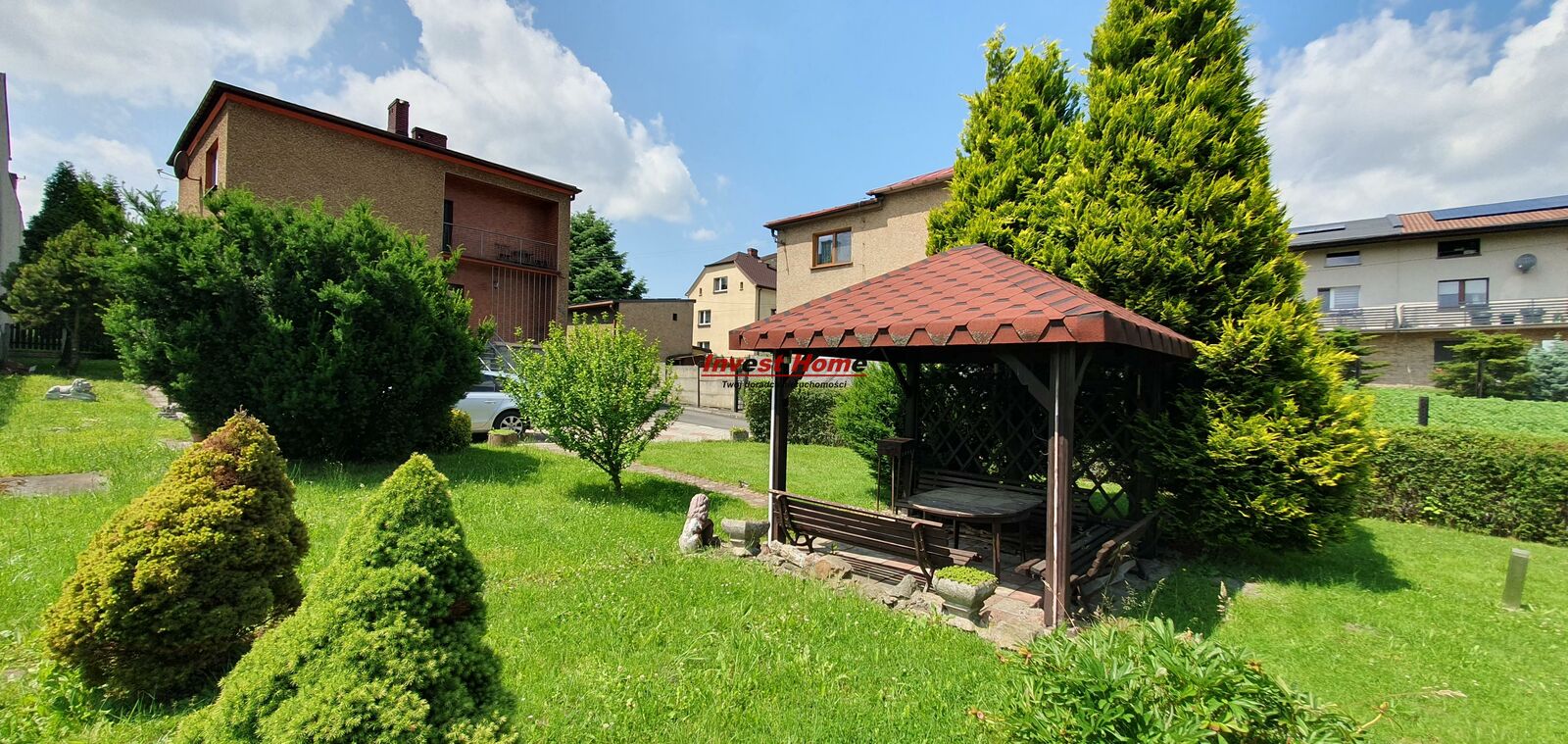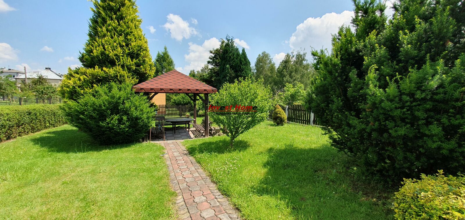 Pięknie urządzony ogród z altaną oraz murowanym, wolnostojącym garażem.