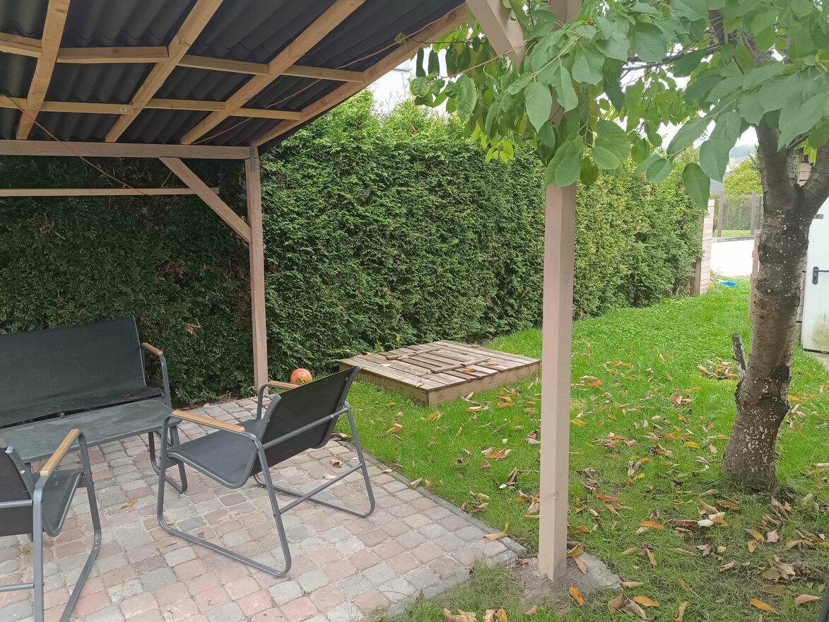 -Działka: 120 m² – wykostkowana, z altaną, miejscem na basen i pomieszczeniem gospodarczym